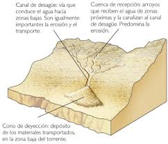- Cono de deyección: es la desembocadura del torrente. Cuando llega al valle, la pendiente disminuye, y el agua pierde velocidad y deposita los materiales transportados por el canal de desgüe, que pueden llegar a formar los llamdos depósitos de piedemonte.